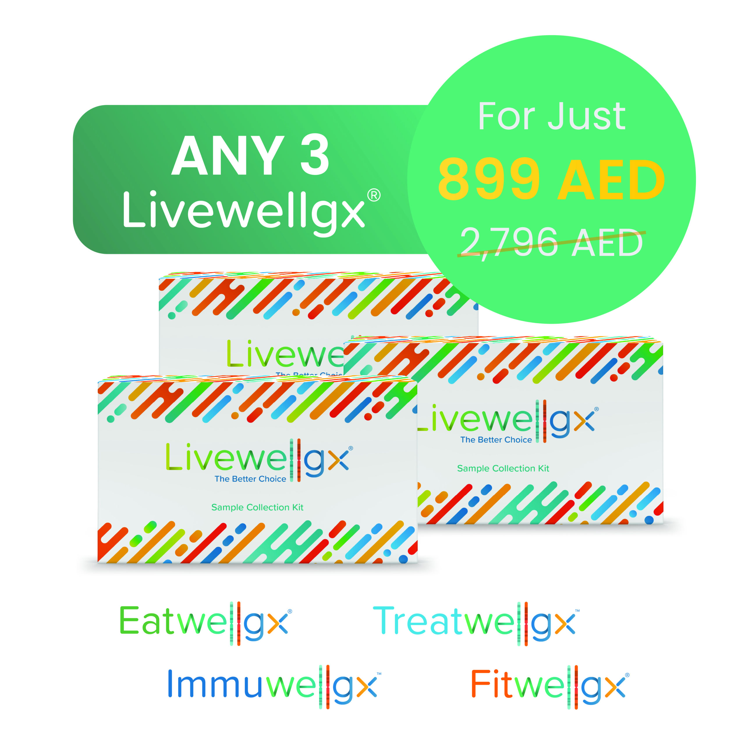 This bundle lets you go deeper with your health by choosing any 3 Livewellgx™ DNA reports—from Eatwell, Fitwell, Immuwell, or Treatwell—for just 899 AED. Plus, you’ll get a FREE Ancestry Test to complete your genetic profile.